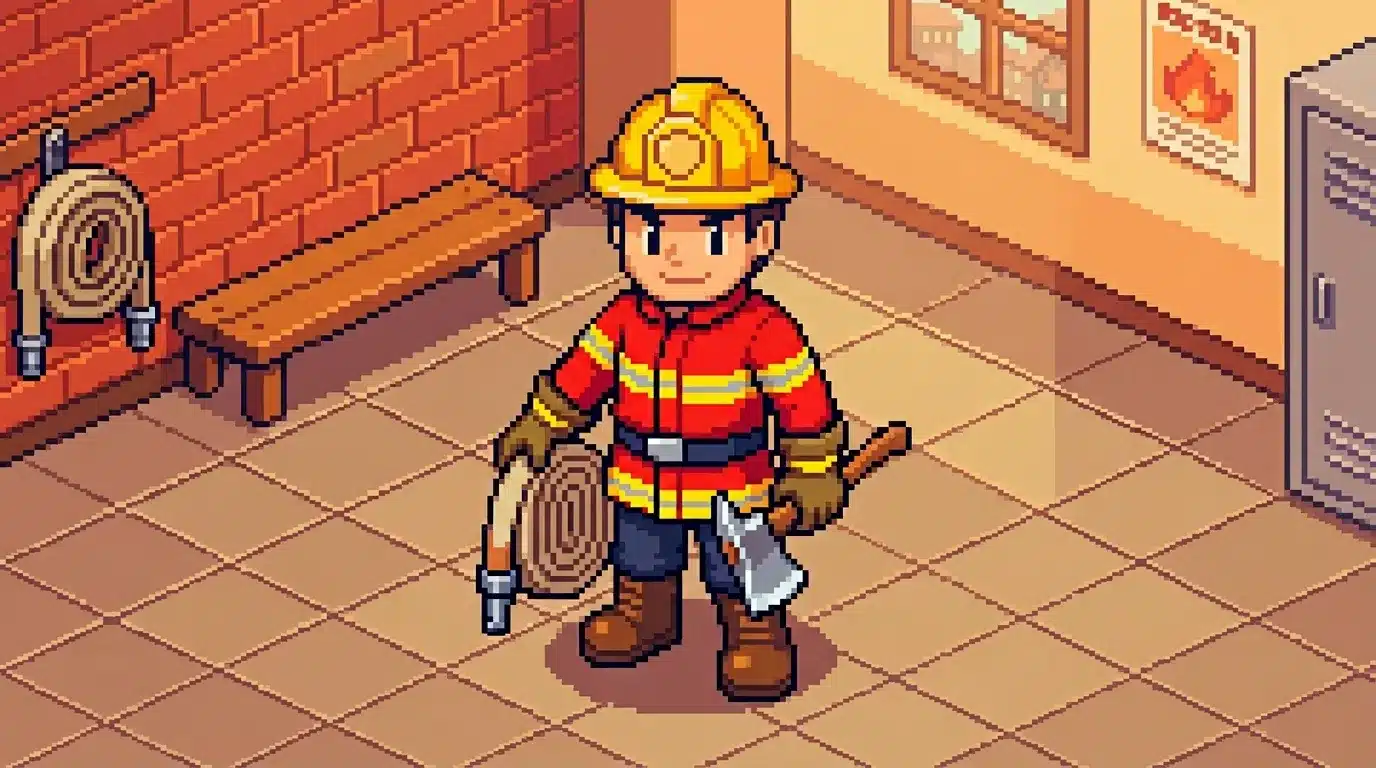 Pixel art pompier équipé dans une caserne de pompiers